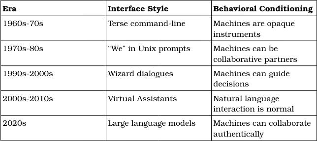 The interface designers did not create this cognitive vulnerability - but rather, they systematically leveraged it. Each “we” in a terminal prompt, each friendly wizard dialogue, trained users to respond to machines as collaborative agents.